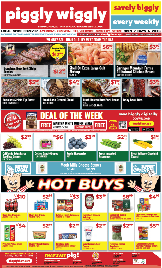 Download our Pig Bham app today and start saving on premium products. Whether you’re planning holiday meals or just doing weekly shopping, Piggly Wiggly premium locations have everything you need at prices you’ll love!