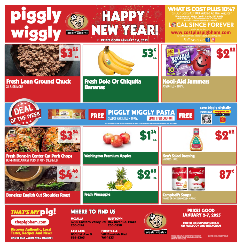 Happy New Year! Discover unbeatable deals this week at Piggly Wiggly Birmingham Cost Plus locations: East Lake, Forestdale, Hueytown, and McCalla.