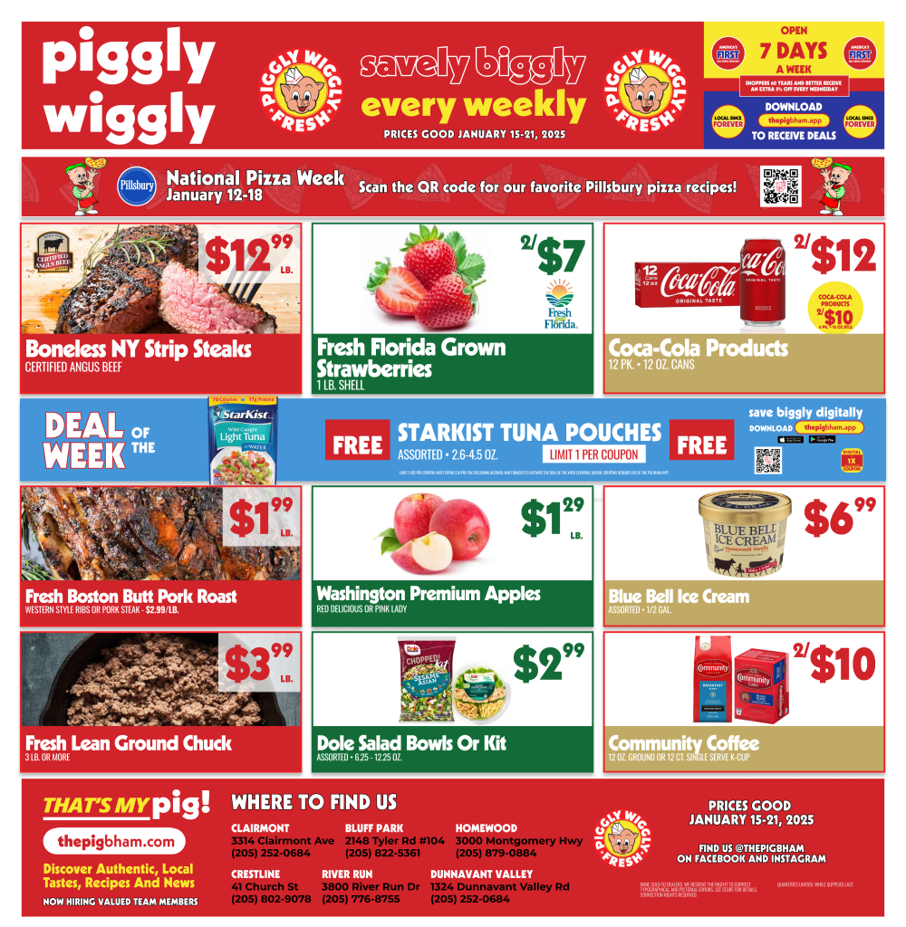 Get ready to save big this week at Piggly Wiggly Birmingham! From January 15 to January 21, 2025, shoppers at our Bluff Park, Clairmont, Crestline, Dunnavant Valley, Homewood, and River Run locations can enjoy unbeatable prices on a wide array of products. Dive into these exciting offers and stock up on all your grocery needs!