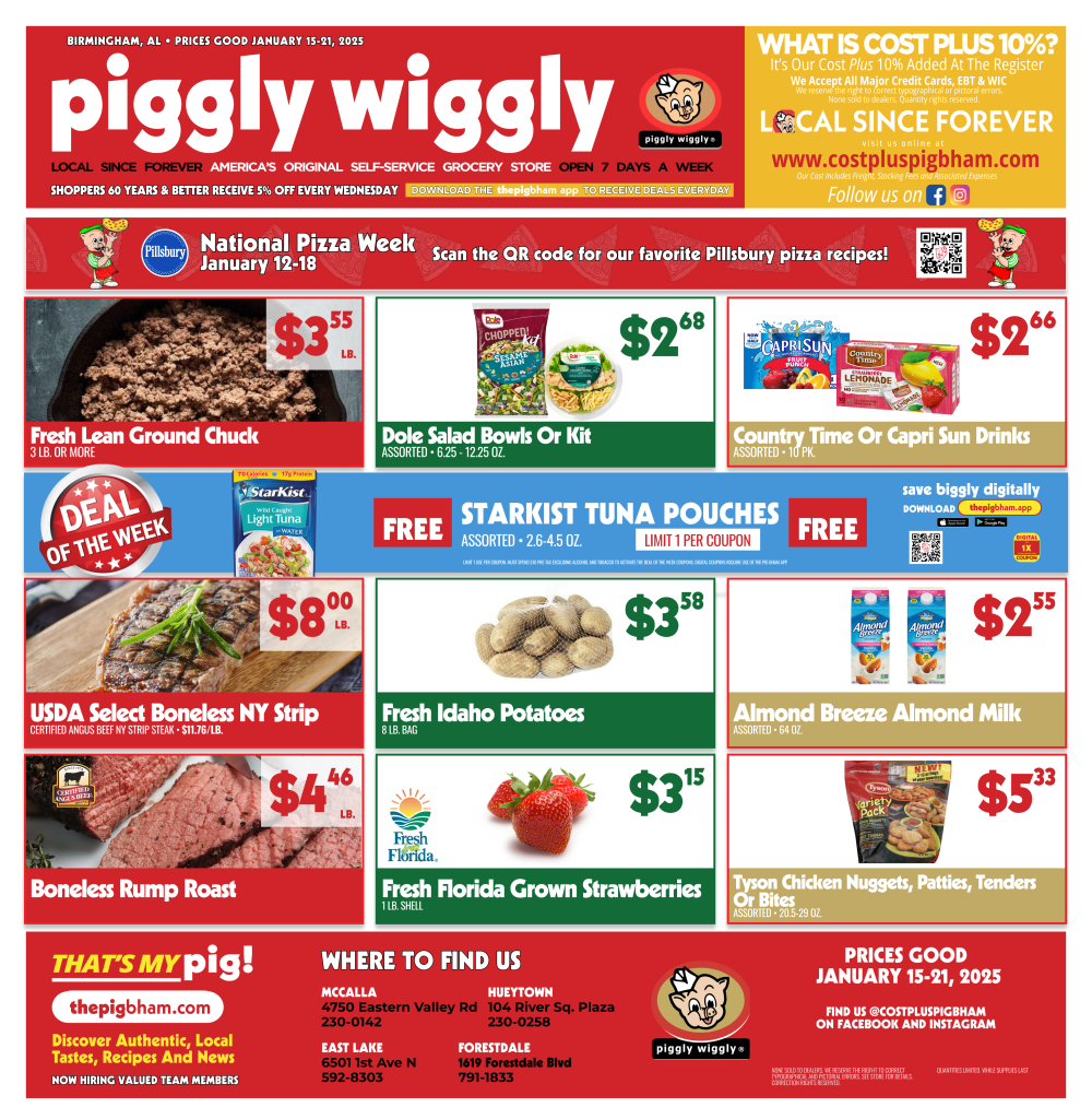 Piggly Wiggly Birmingham makes grocery shopping affordable and convenient. Visit us at East Lake, Forestdale, Hueytown, or McCalla this week to take advantage of these deals. See you at The Pig!