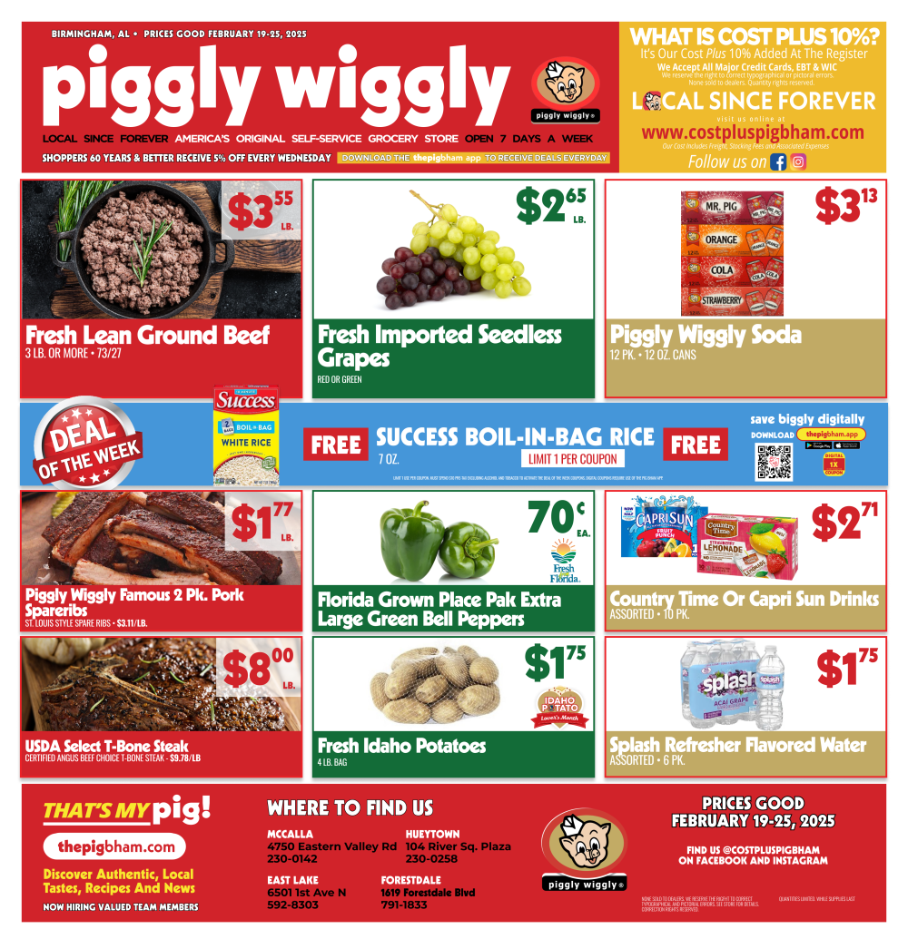 Get ready for huge savings at Piggly Wiggly Birmingham Cost Plus locations! From February 19 through February 25, 2025, enjoy great deals on fresh meats, produce, pantry staples, and household essentials at our East Lake, Forestdale, Hueytown, and McCalla stores.
