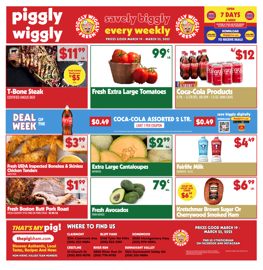 Get ready to save big at Piggly Wiggly Birmingham! From March 19 through March 25, 2025, our Bluff Park, Clairmont, Crestline, Dunnavant Valley, Homewood, and River Run locations are stocked with incredible deals on fresh meats, produce, and pantry staples. Whether you’re planning family dinners, stocking up on snacks, or filling your fridge with fresh ingredients, we’ve got unbeatable prices just for you!
