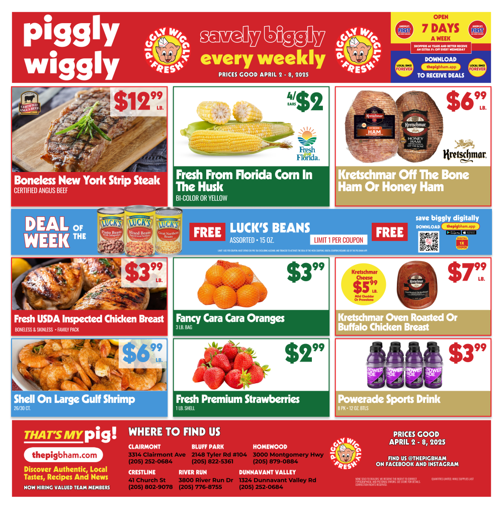 Get ready to save big, Birmingham! The latest Piggly Wiggly Weekly Ad is packed with fresh deals and local favorites that’ll have your shopping list jumping for joy. These amazing offers are valid at our Bluff Park, Clairmont, Crestline, Dunnavant Valley, Homewood, and River Run locations from April 2 through April 8, 2025. Shop local, save biggly, and enjoy the best in quality and value all week long!