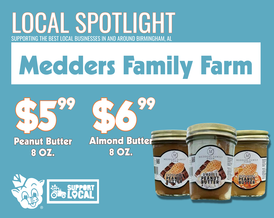 This week, Piggly Wiggly Birmingham is proud to feature Medders Family Farm, a local favorite known for their handcrafted nut butters made right here in Alabama. Whether you’re looking for a protein-packed snack or a new twist on your morning toast, their rich, creamy spreads are a perfect pantry addition.