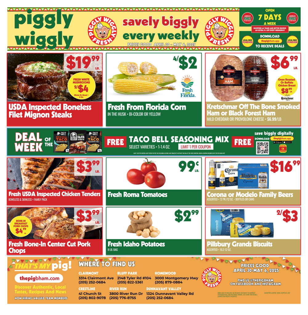 Get ready to save biggly this week at Piggly Wiggly Birmingham! We’re bringing you an incredible lineup of fresh deals, unbeatable prices, and exclusive digital coupons to make your grocery shopping more affordable and enjoyable than ever. These savings are valid at the following Birmingham area locations, listed in alphabetical order: Bluff Park, Clairmont, Crestline, Dunnavant Valley, Homewood, and River Run.