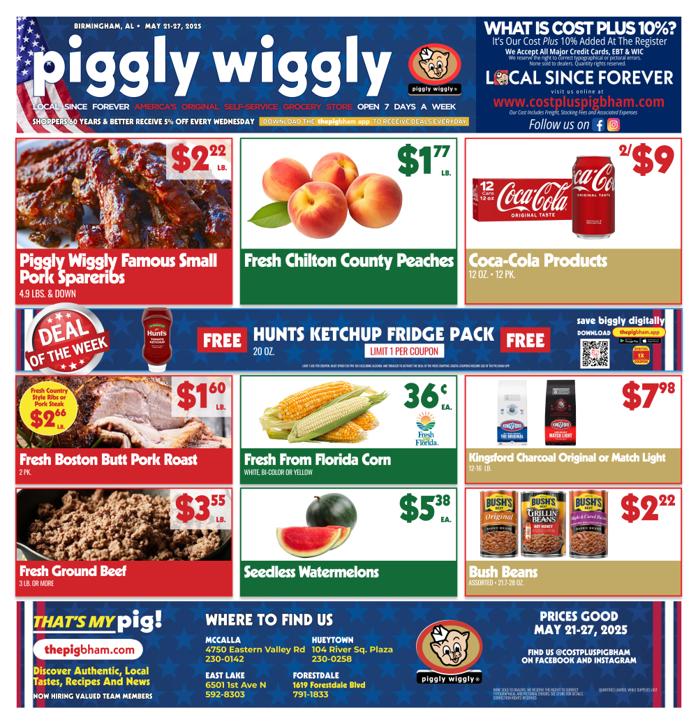 Get ready to savely biggly this Memorial Day week at Piggly Wiggly! From May 21 through May 27, 2025, shop unbeatable deals at our Cost Plus locations in East Lake, Forestdale, Hueytown, and McCalla. Whether you’re stocking up for cookouts or everyday meals, our stores are full of fresh, flavorful savings just in time for the holiday!