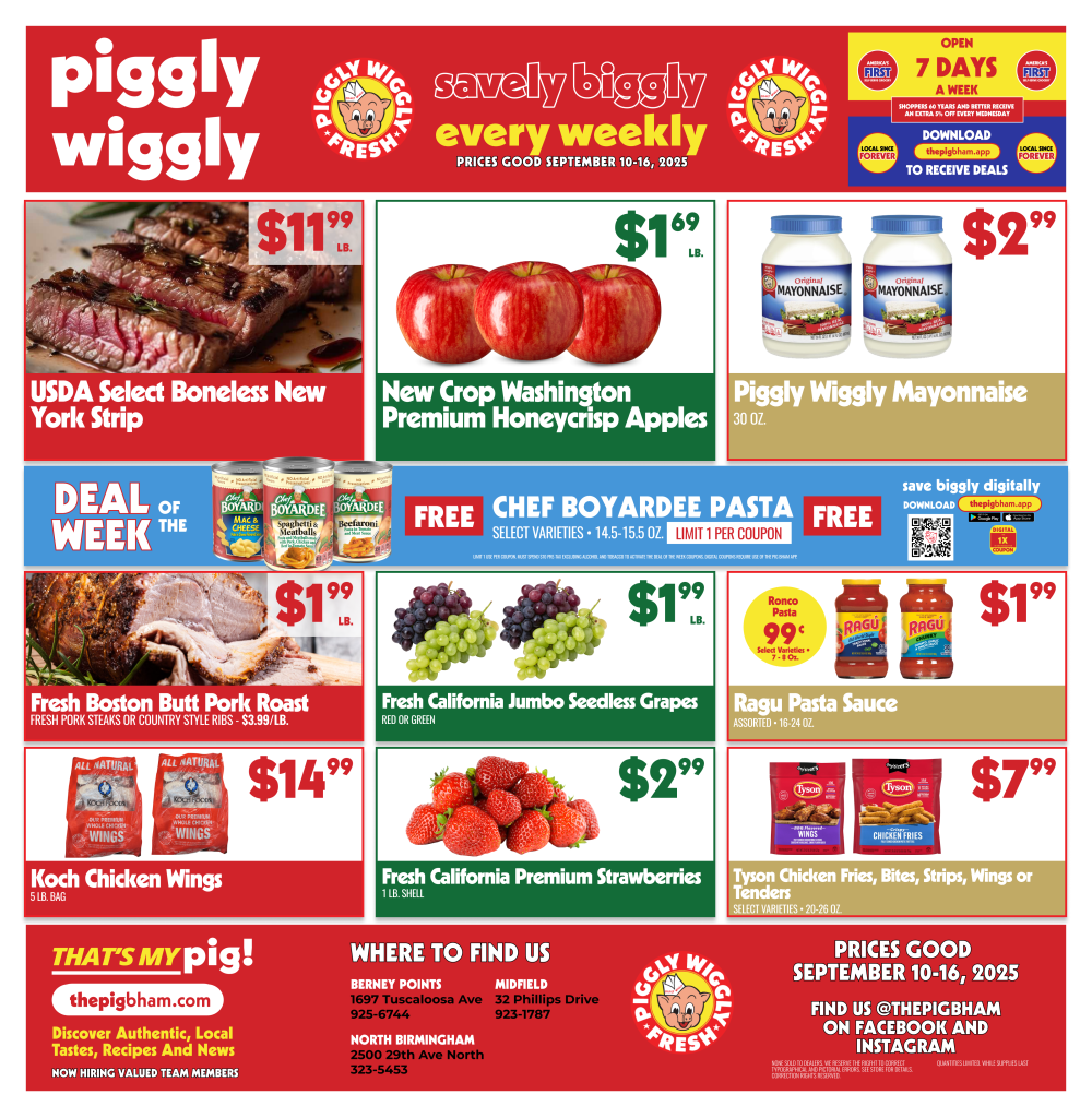 Make the most of your grocery trip with fresh deals, digital savings, and local service you trust. These specials are available September 10–16, 2025, at your Piggly Wiggly locations in Berney Points, Midfield, and North Birmingham. Shop local. Save biggly. Only at The Pig.