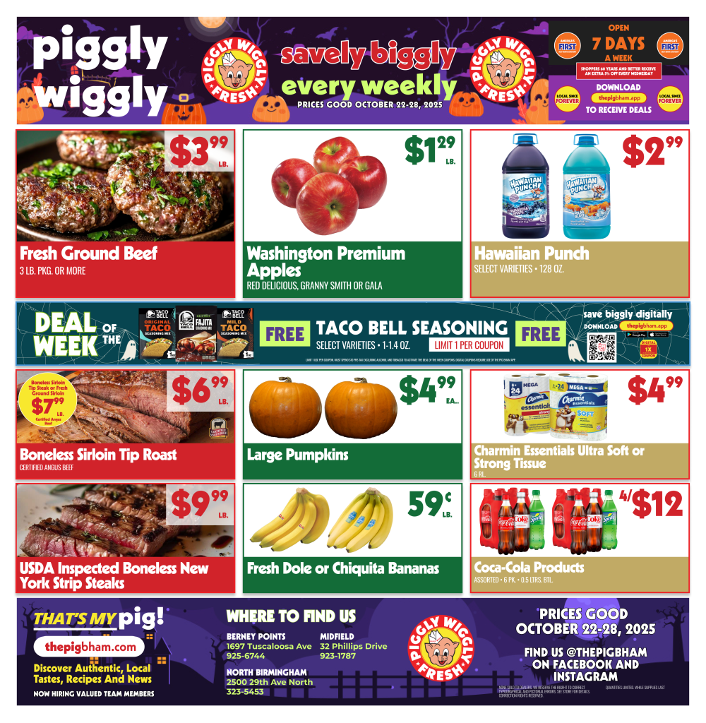 Celebrate the spooky season with serious savings at Piggly Wiggly Birmingham! Our Berney Points, Midfield, and North Birmingham stores are packed with treats (no tricks!) for your fridge, pantry, and freezer. From fall produce to hearty meats and Halloween-ready snacks, we’ve got everything you need to keep your grocery bill low and your spirits high this week.