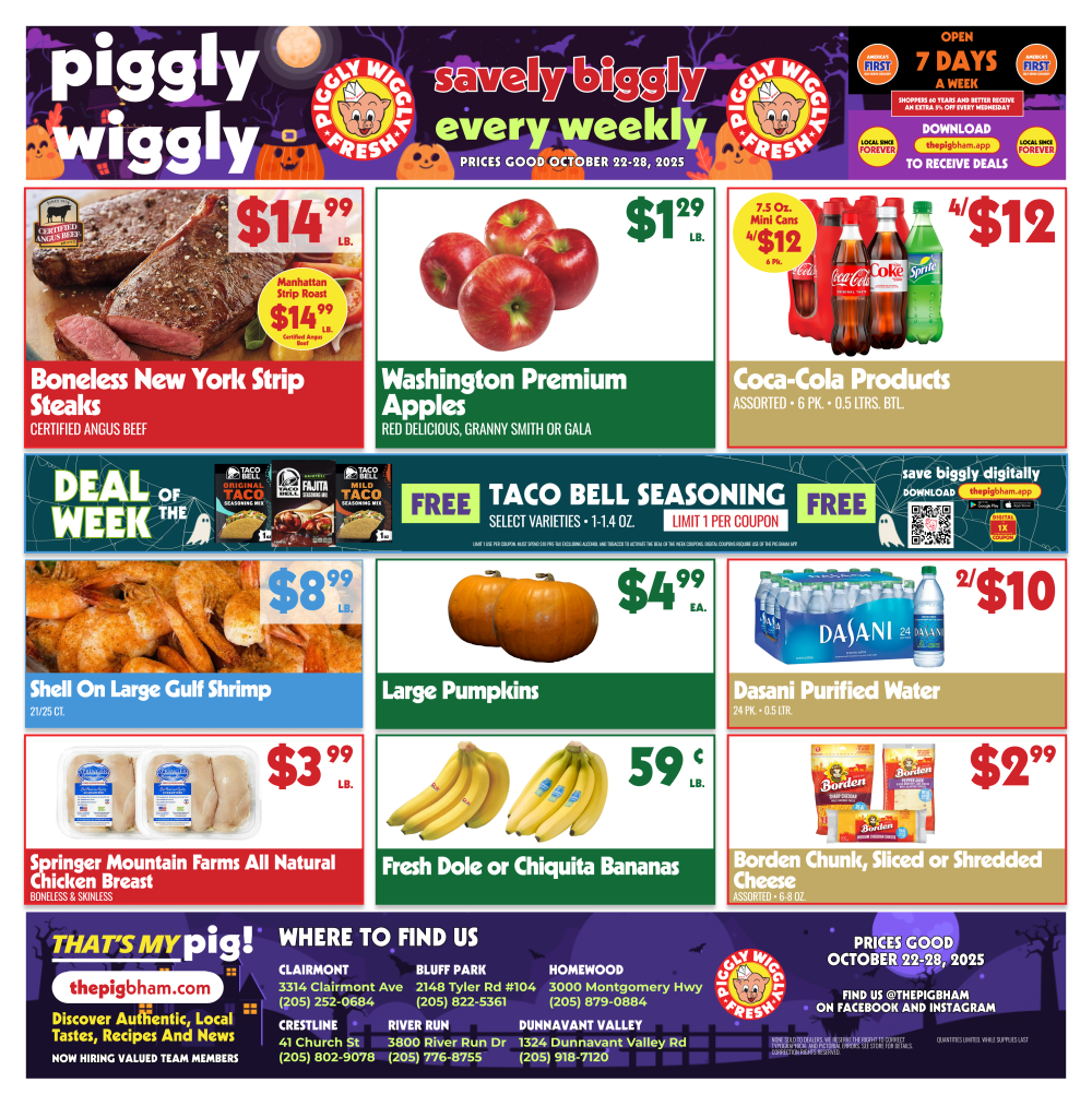 Get these Weekly Ad Deals at Piggly Wiggly Birmingham now through October 28, 2025. Visit any of our Birmingham locations — Bluff Park, Clairmont, Crestline, Dunnavant Valley, Homewood, and River Run — and fill your cart with quality, value, and spooky-good savings.