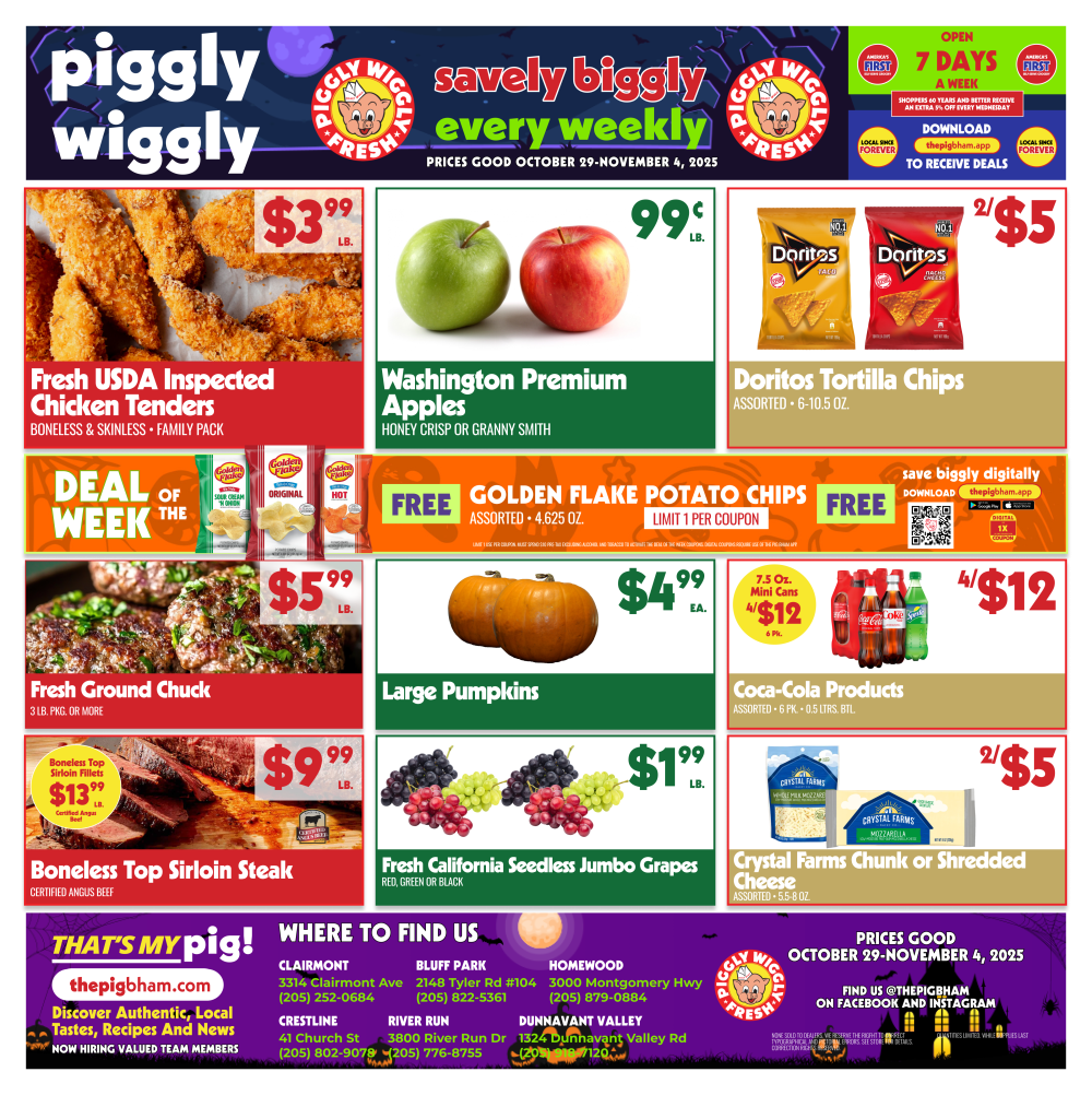 All offers are valid October 29 through November 4, 2025, at participating Bluff Park, Clairmont, Crestline, Dunnavant Valley, Homewood, and River Run locations. Quantities are limited and deals are while supplies last, so stop by your neighborhood Pig and shop the savings before they’re gone!