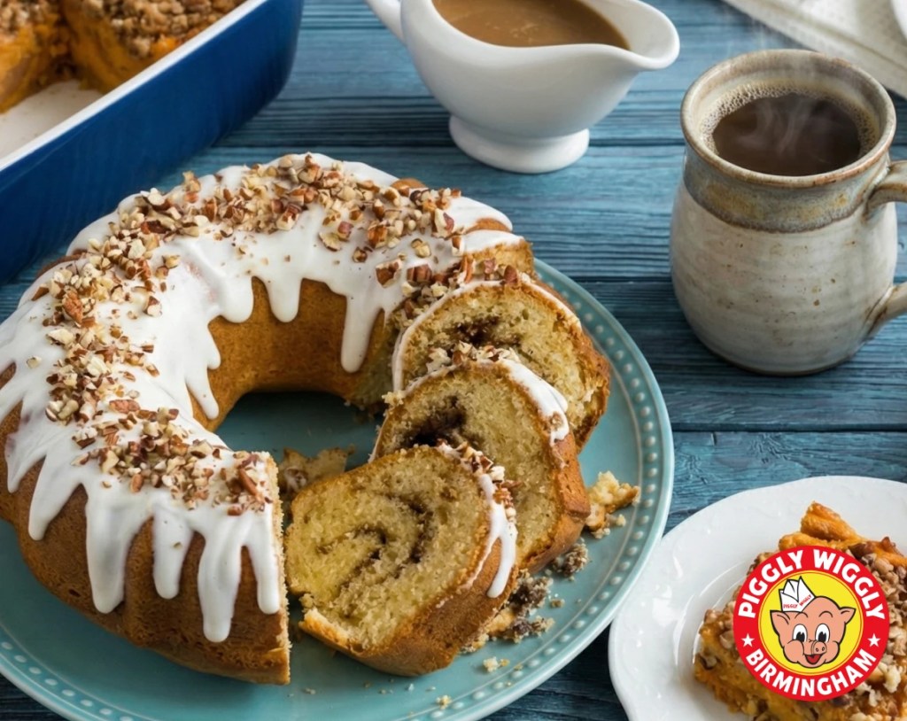 Start your morning right with this delicious iced Bundt coffee cake, topped with crunchy pecans and paired perfectly with a fresh cup of coffee—available now at Piggly Wiggly Birmingham.