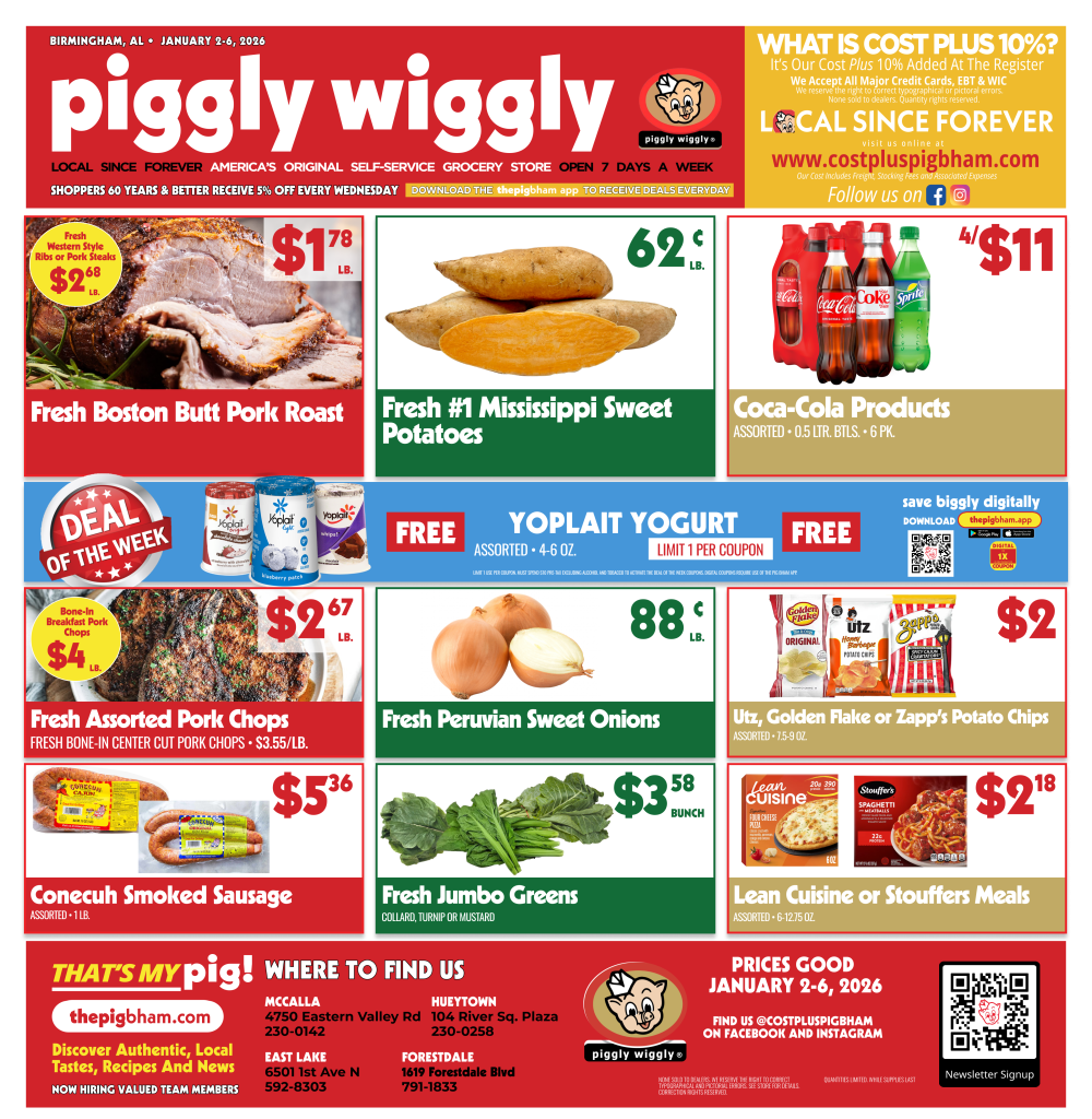 We’re kicking off the New Year with unbeatable savings at Piggly Wiggly Birmingham’s Cost Plus locations in East Lake, Forestdale, Hueytown, and McCalla. Whether you’re starting a post-holiday budget or refilling your fridge and pantry for January, The Pig is your go-to grocery store for quality products and value-packed deals—all week long.
